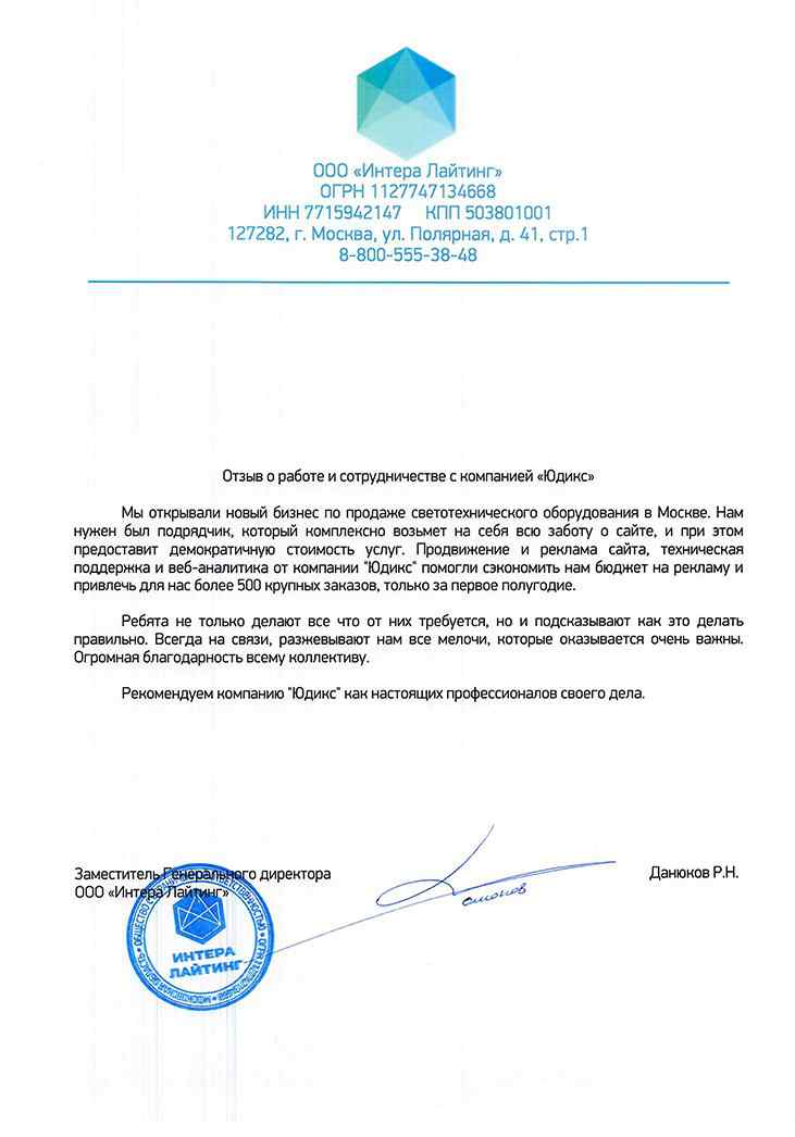 Мы открывали новый бизнес по продаже светотехнического оборудования в Москве. Нам нужен был подрядчик, который комплексно возьмет на себя всю заботу о сайте по нормальной цене. SEO-продвижение и реклама сайта, техподдержка и веб-аналитика от Юдикс помогли сэкономить на рекламе и привлечь для нас более 500 крупных заказов только за первое полугодие. Ребята не просто делают все, что от них требуется, но и подсказывают как делать правильно. Всегда на связи, разжевывают все по мелочам, которые оказываются очень важны. Рекомендуем этих ребят как настоящих профессионалов своего дела.